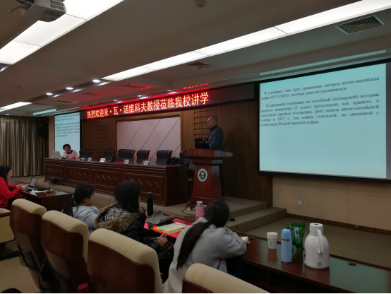 (通讯员 戴玉敏)冬日进补之际,学术盛宴不断。12月20日下午两点半,由教务处主办、历史文化学院承办的第183期“博雅大讲堂”在逸夫国际会议中心一楼报告厅举行。讲座的主题是“苏联和俄罗斯历史教科书中的中国抗日战争”,主讲人是俄罗斯著名历史学家米·瓦·诺维科夫教授。本次讲座由历史文化学院副院长邢来顺教授主持,黄明慧博士现场翻译。