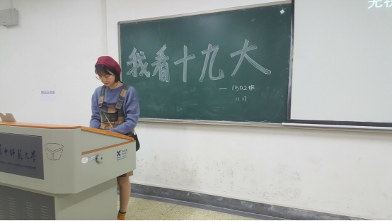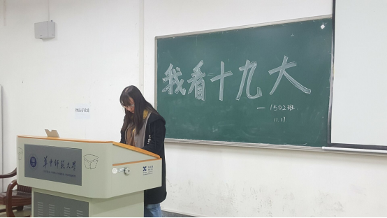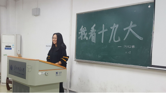 (通讯员:谢静)11月17日,历史文化学院本科1502班“我看十九大”主题班会在8309教室举行,本次班会由团支书陈洋主持。由于多媒体故障,电脑无法使用,最终班会只能采用板书,但依旧没有影响到同学们参与的热情。